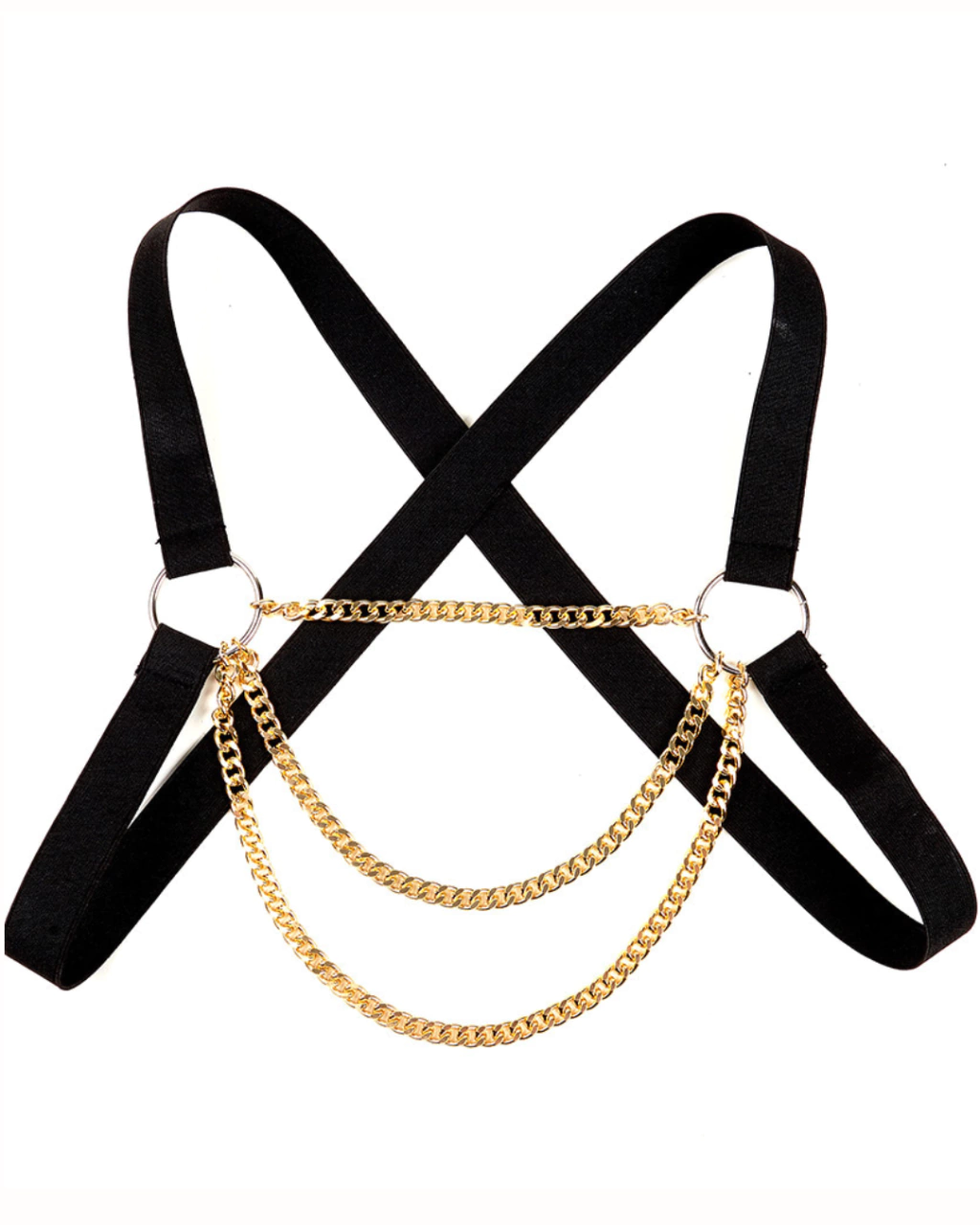 Descubra o poder do Harness Masculino, um cinto de restrição feito para homens que desejam unir estilo ousado à funcionalidade BDSM. Com um design exclusivo em X, esta peça elástica valoriza e acentua o torso, destacando sua presença com um toque de luxo proporcionado pelas correntes douradas.